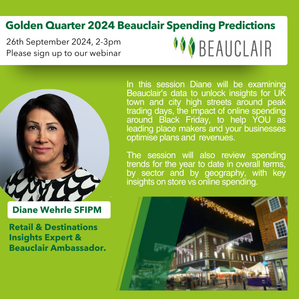 Join Beauclair for their Golden Quarter 2024 Spending Predictions webinar on 26 September. In this session you will be hearing from their Retail and Destinations Insights Expert, Diane Wehrle, who will share key insights on UK town and city high streets around peak trading days to help your business optimise plans and revenues.